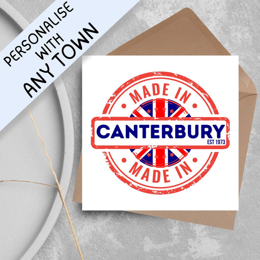 Custom Made in Britain Birthday Card, Any Town Personalised, Birth Date Card