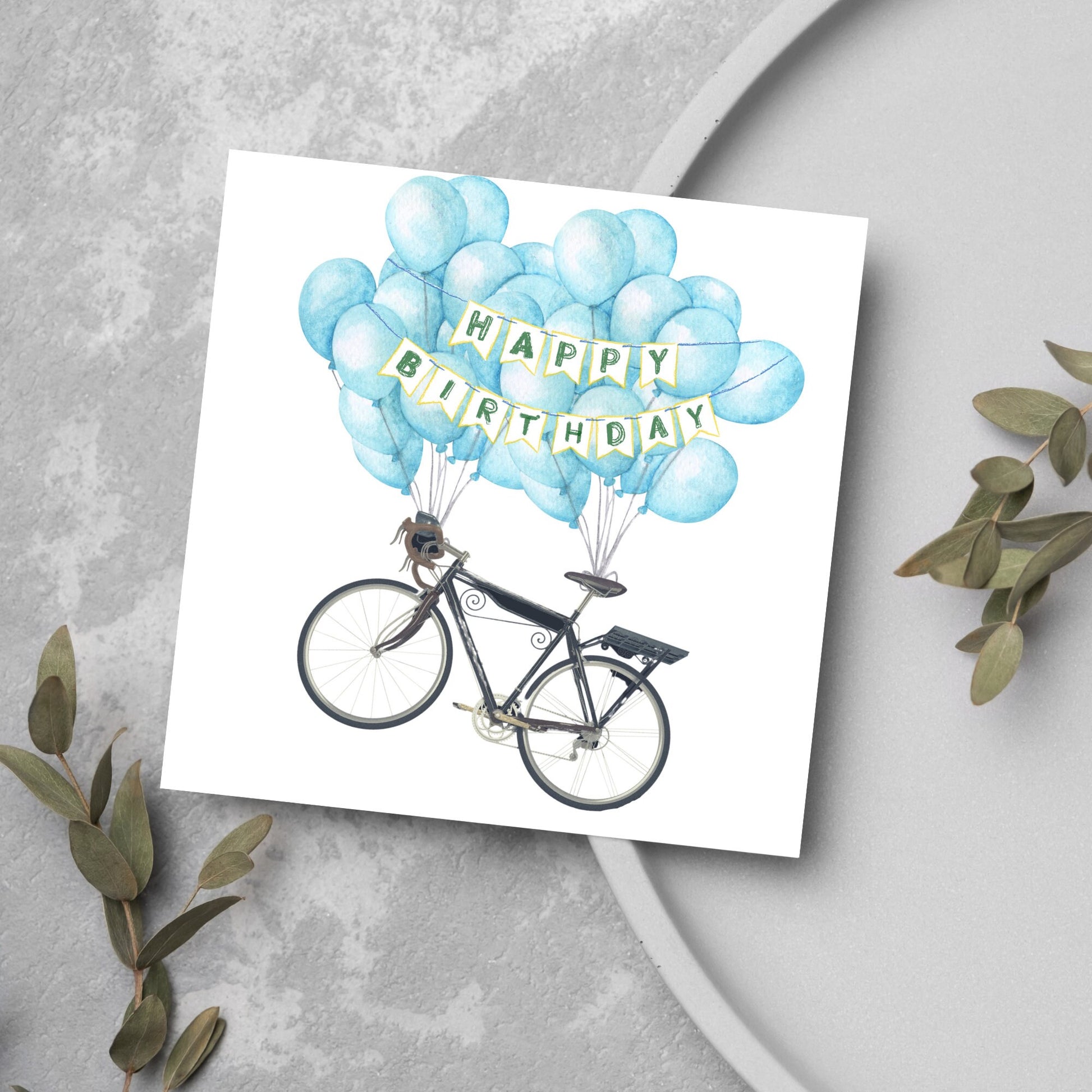 Introducing our exquisite Blue Bike Fine Art Birthday Card. This uniquely crafted card features a bicycle floating away with happy Birthday balloons