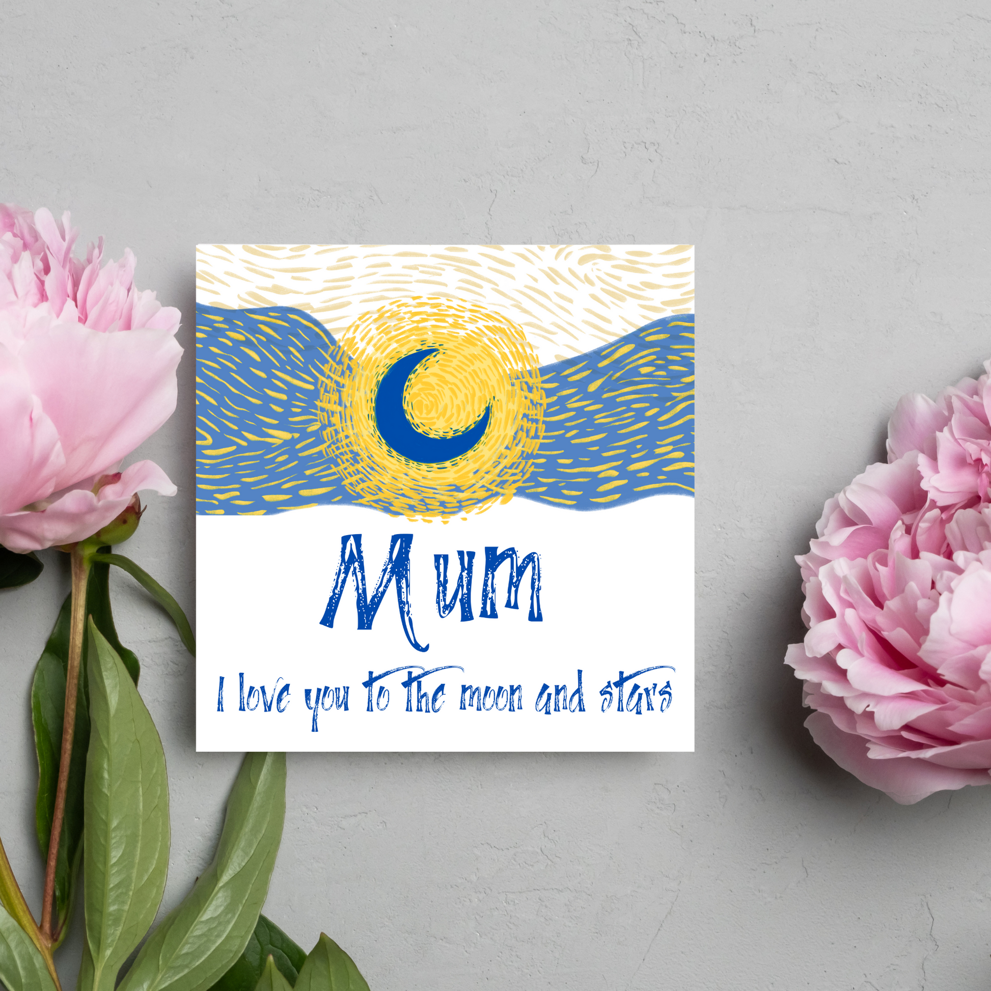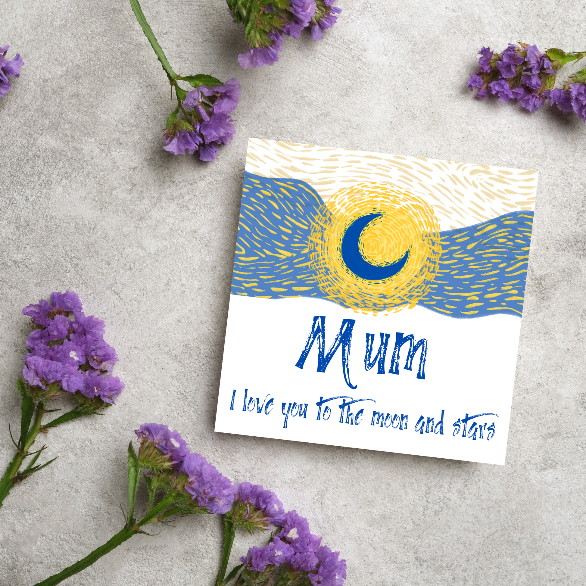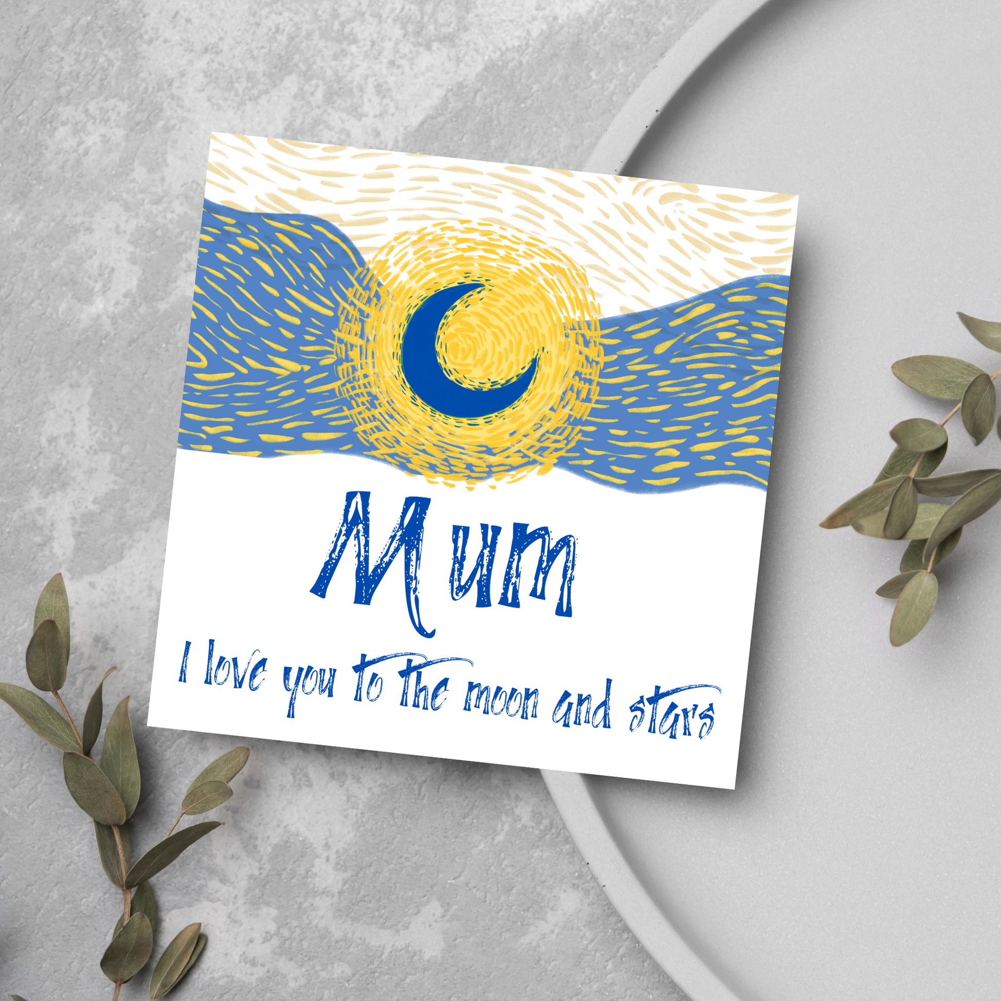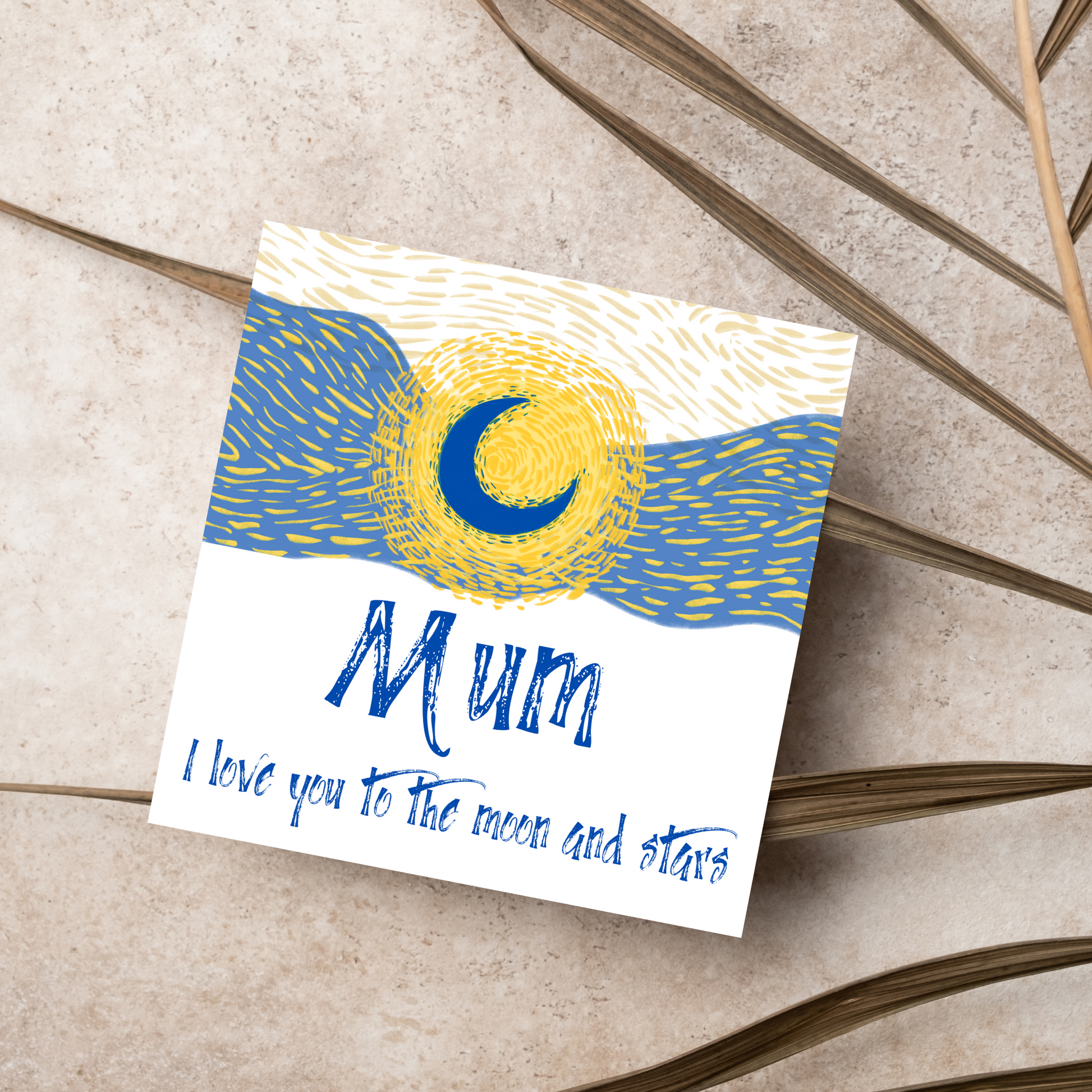 Show Mum just how much she means with this starry and heartfelt Mother’s Day card! Featuring a stunning celestial design inspired by Van Gogh, it beautifully expresses your love—to the moon and stars and beyond. A perfect keepsake for a truly special mum. ✨🌙