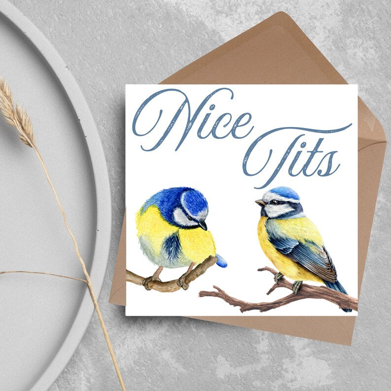 Brighten someone's day with this quirky and humorous card featuring adorable bluetits and the playful phrase "nice tits." Perfect for birthdays, anniversaries, or just because. Share a laugh and some cheeky fun with your wife, girlfriend, or friend.