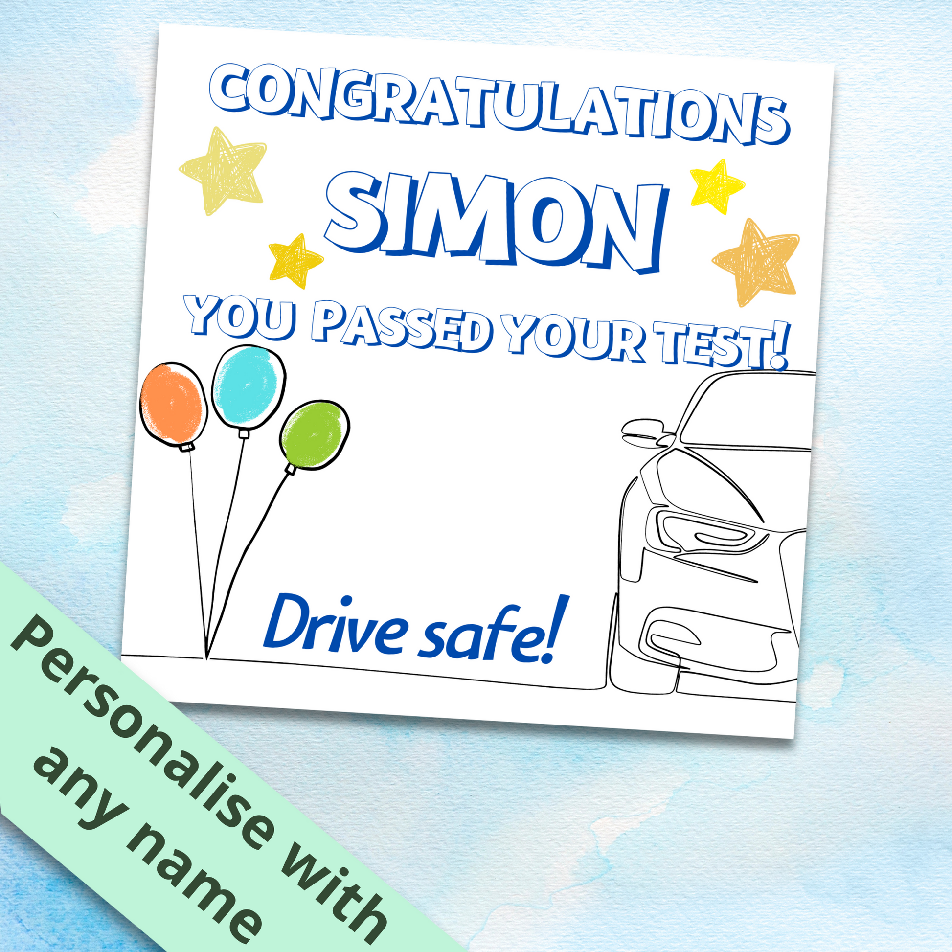 Introducing our Congratulations Card! Featuring a charming line drawing of a car with balloons and the message "Congratulations [Name], you passed your test! Drive safe!" Personalised with cartoon stars next to the name. Celebrate their achievement in style!