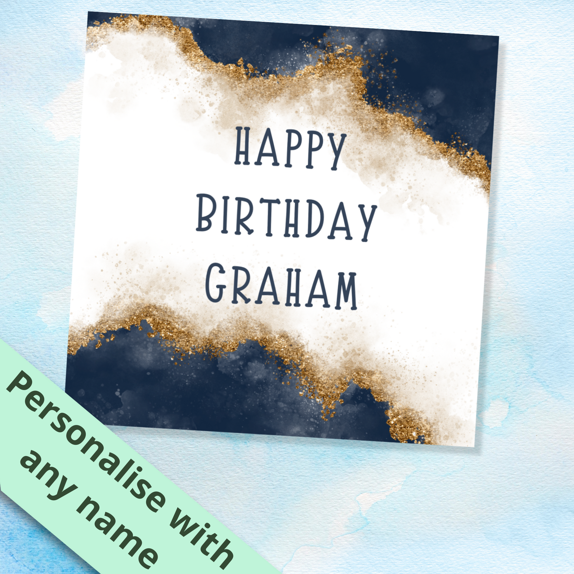 Celebrate the joyous occasion with our personalised Birthday Card, a perfect blend of sophistication and personal touch. This exquisite card features a white background adorned with a navy blue, capitalised "Happy Birthday" that makes a bold and beautiful statement. What sets this card apart is the opportunity to customize it with your name, adding a unique and thoughtful touch to the celebration.