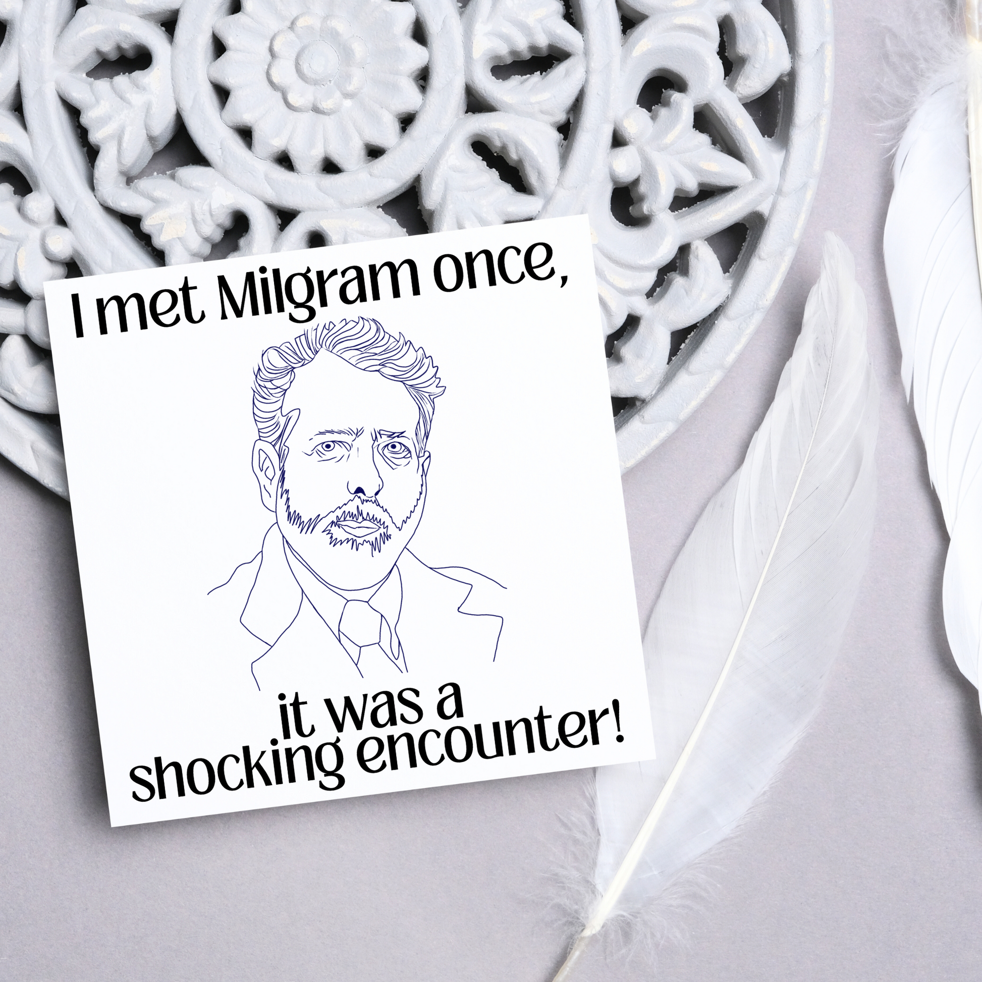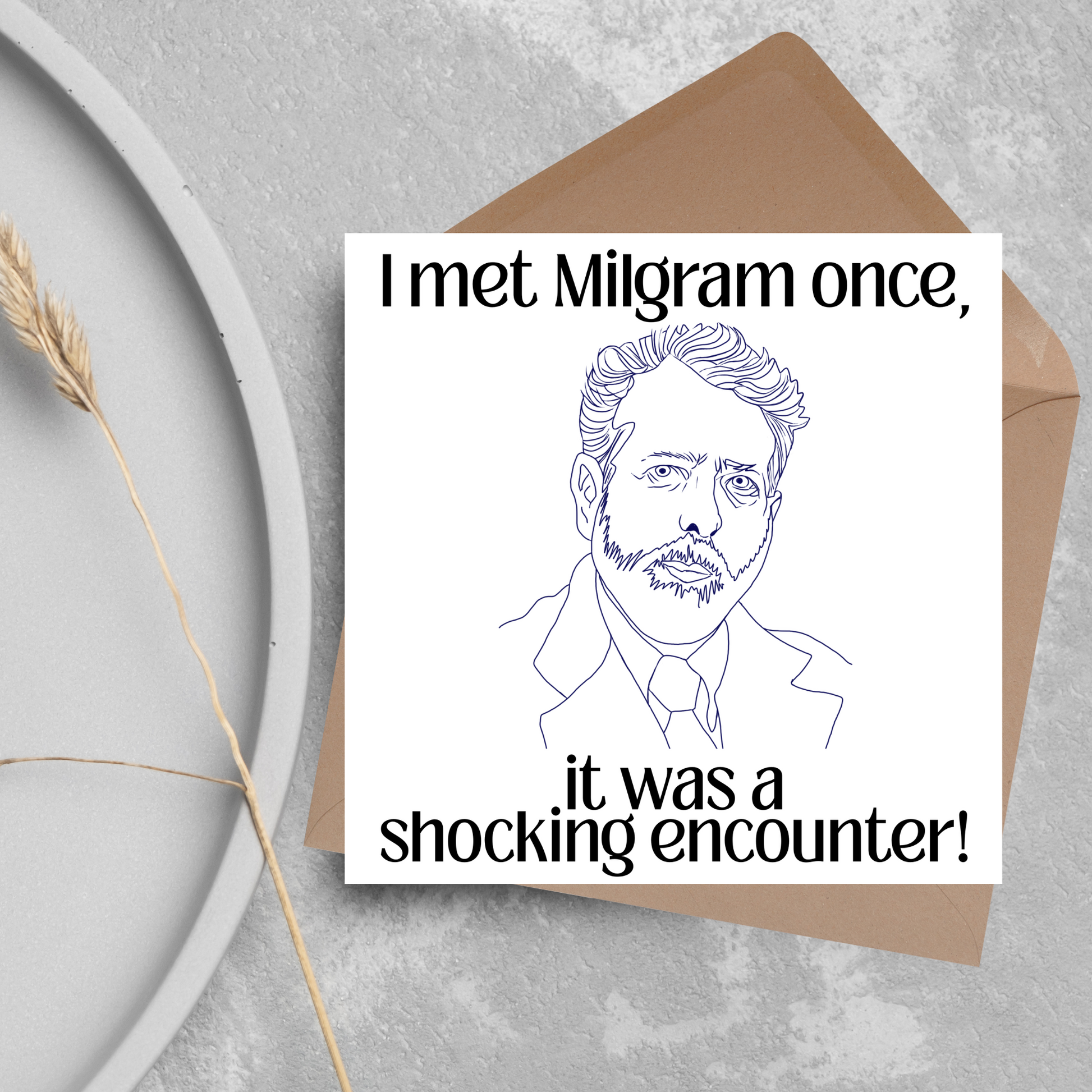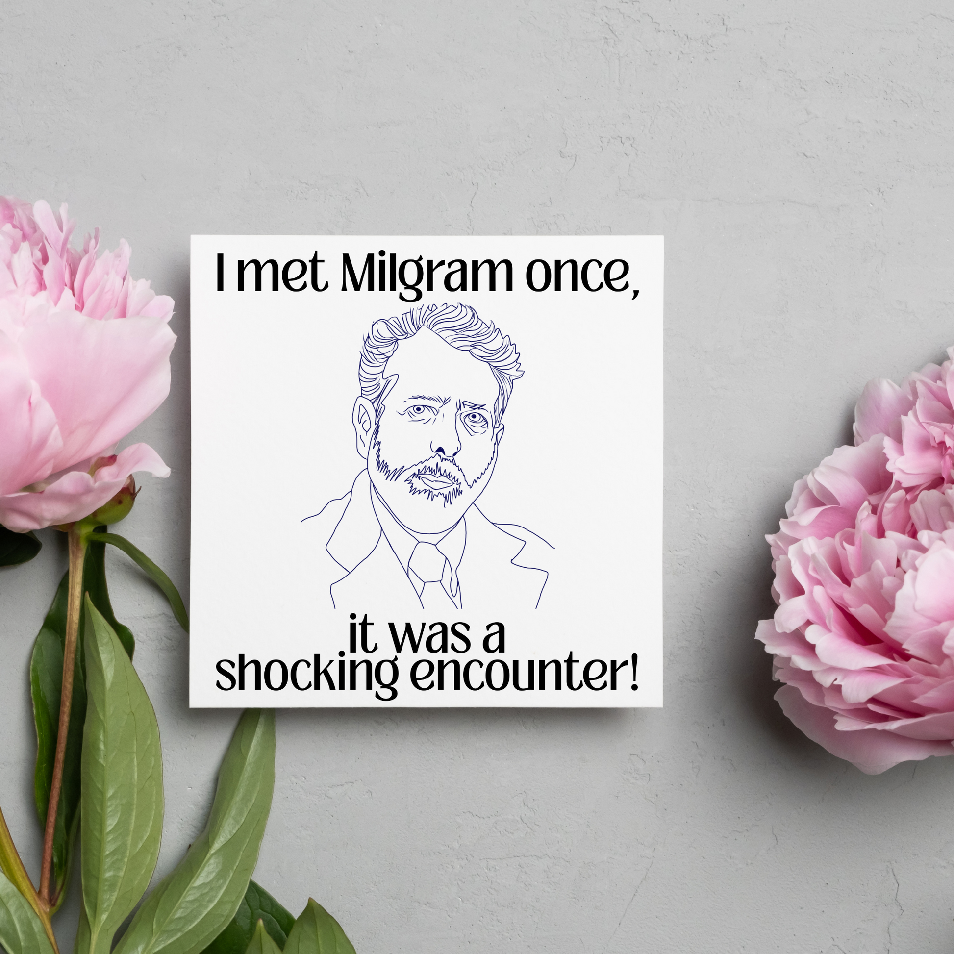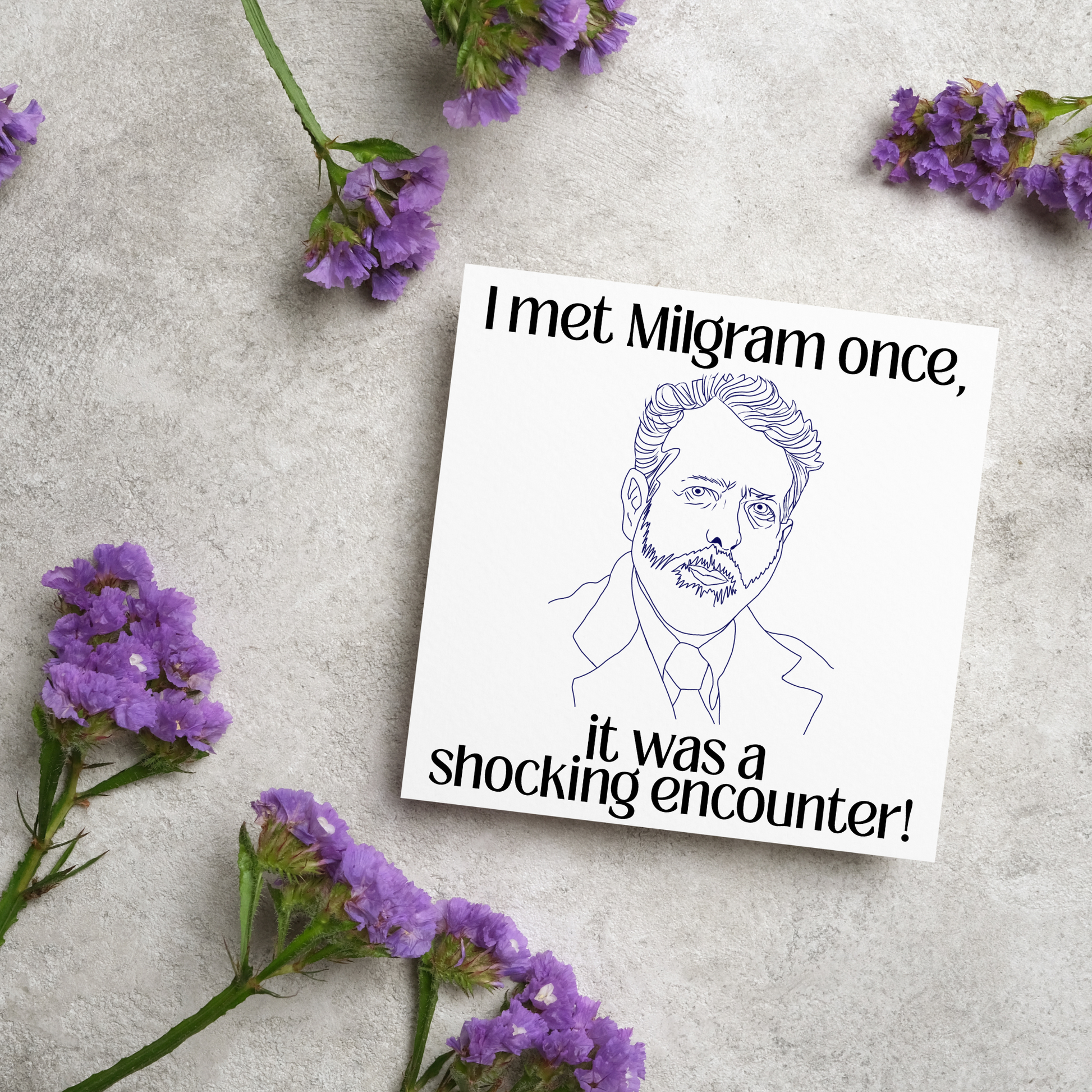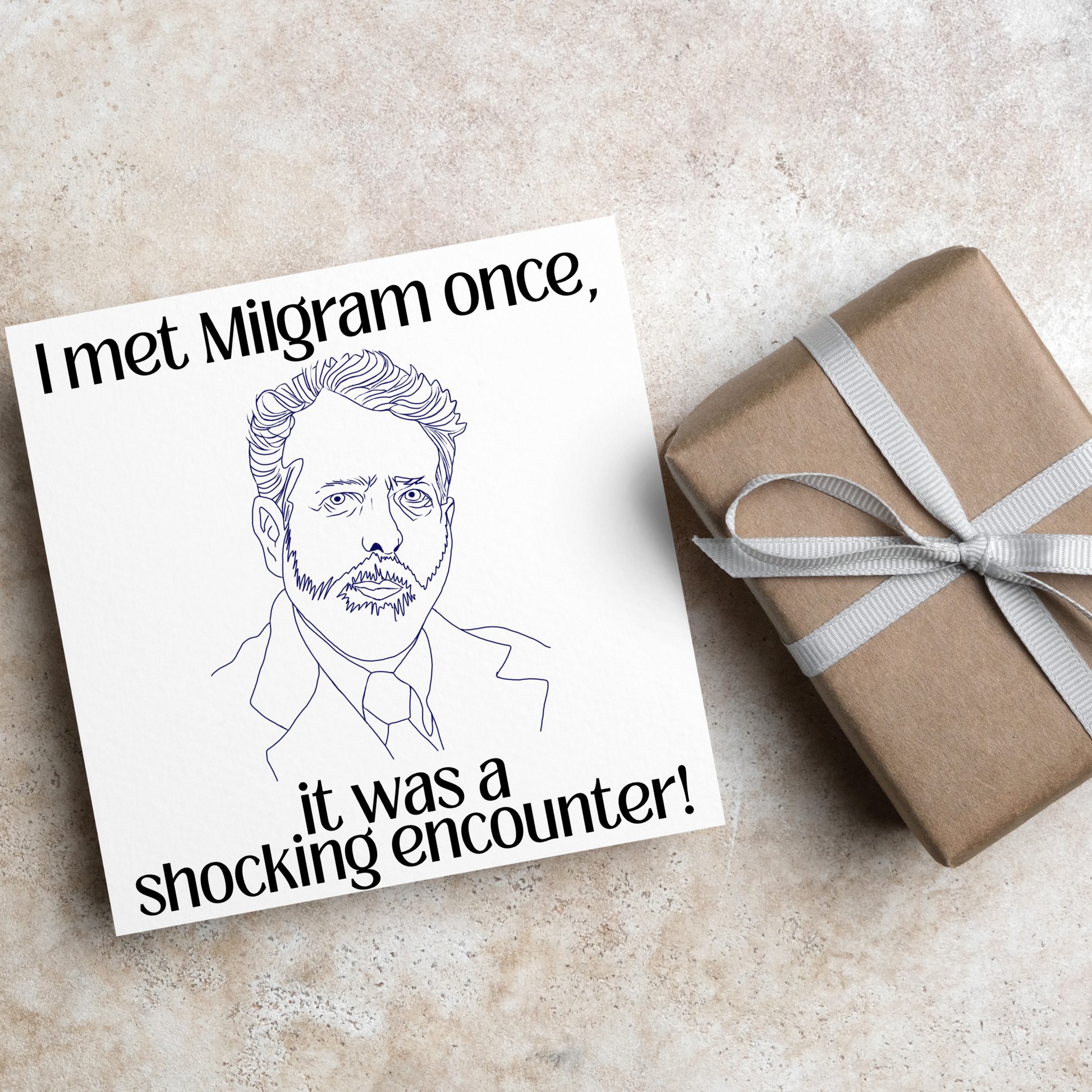 Introducing our uniquely designed birthday card, featuring a whimsical illustration of Stanley Milgram accompanied by the witty caption: