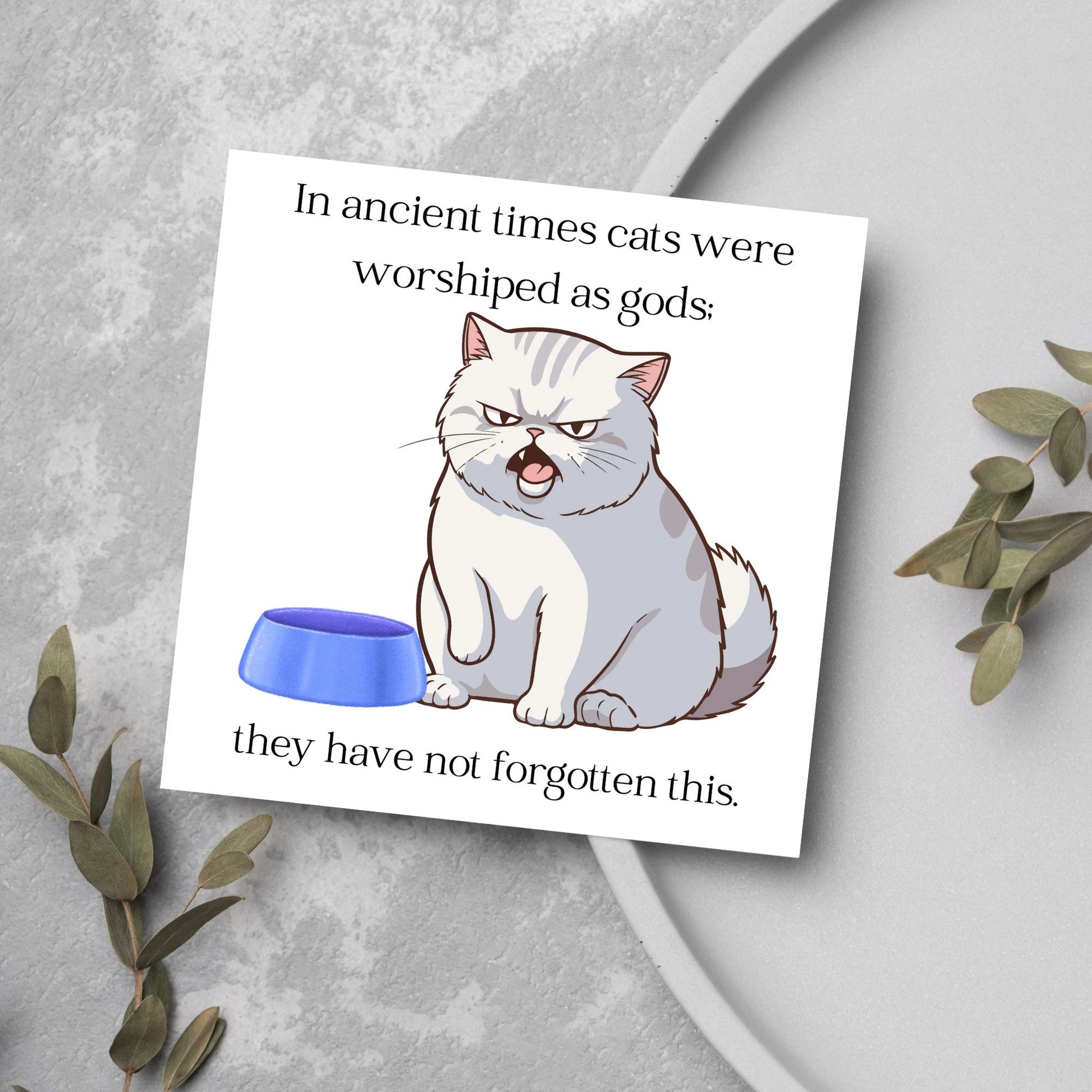 Behold the Divine Feline Dictator greetings card, featuring a magnificently rotund grey and white cat channelling the spirit of ancient Egyptian deities. In this masterpiece of feline expression, our plump protagonist points dramatically to an empty food bowl, mid-meow, with an unmistakable air of annoyance.