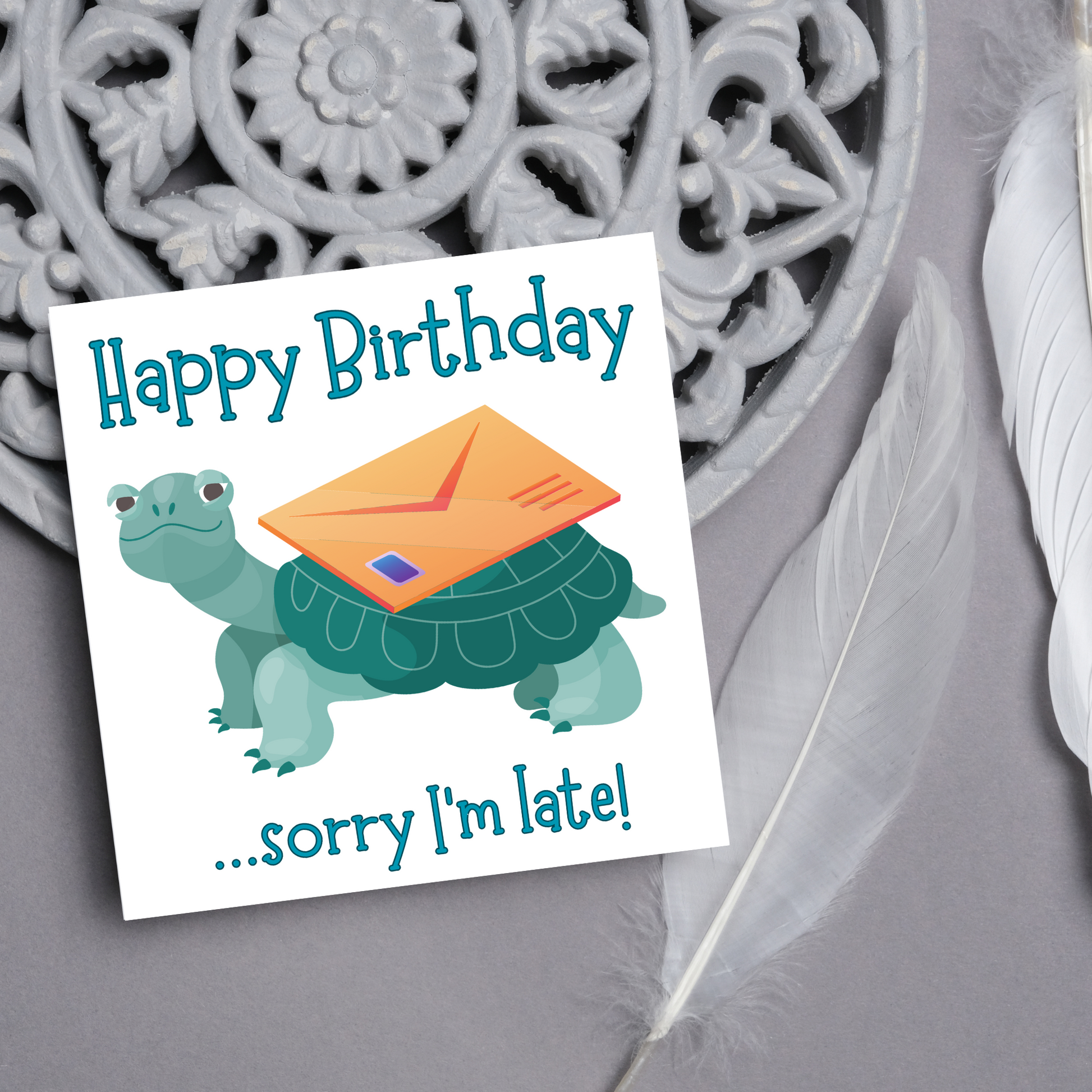 Did you miss your friend's birthday? Don't worry, send them this adorably late birthday card with a picture of a leisurely tortoise.