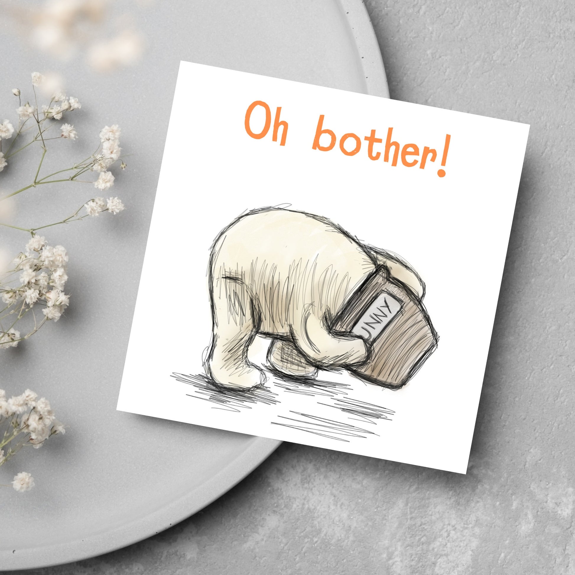 Embark on a heartwarming journey into the Hundred Acre Wood with our "Oh, Bother" greetings card featuring the one and only Winnie the Pooh! This timeless creation captures the classic charm of the silly old bear in a moment we all know too well – with his head blissfully stuck in a honey jar.